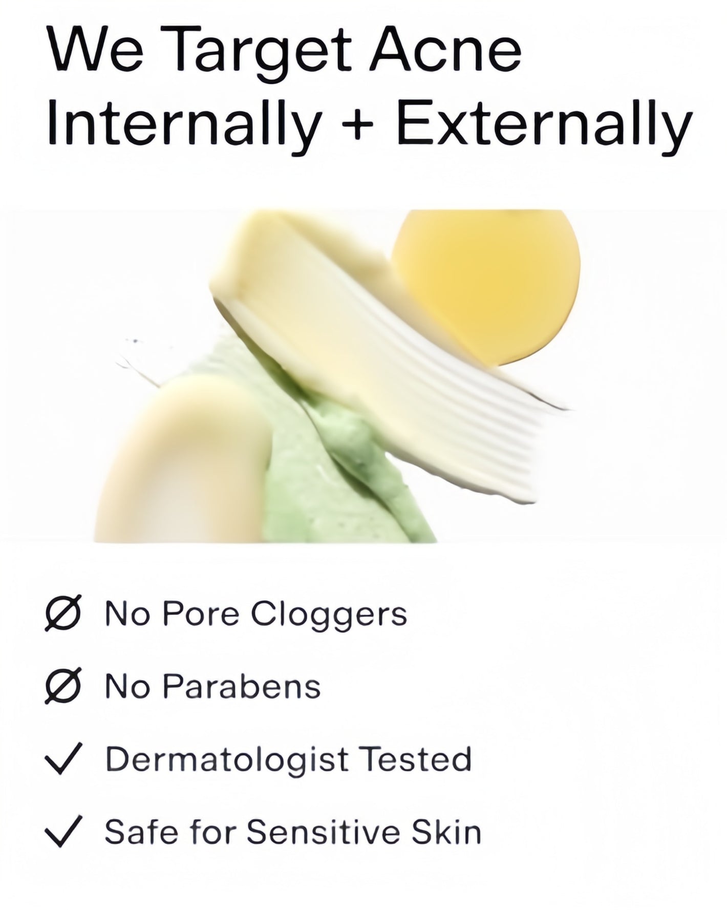 Our topicals contain no pore-clogging ingredients, ever, and our supplements use whole-body ingredients to support clear skin from the inside out.